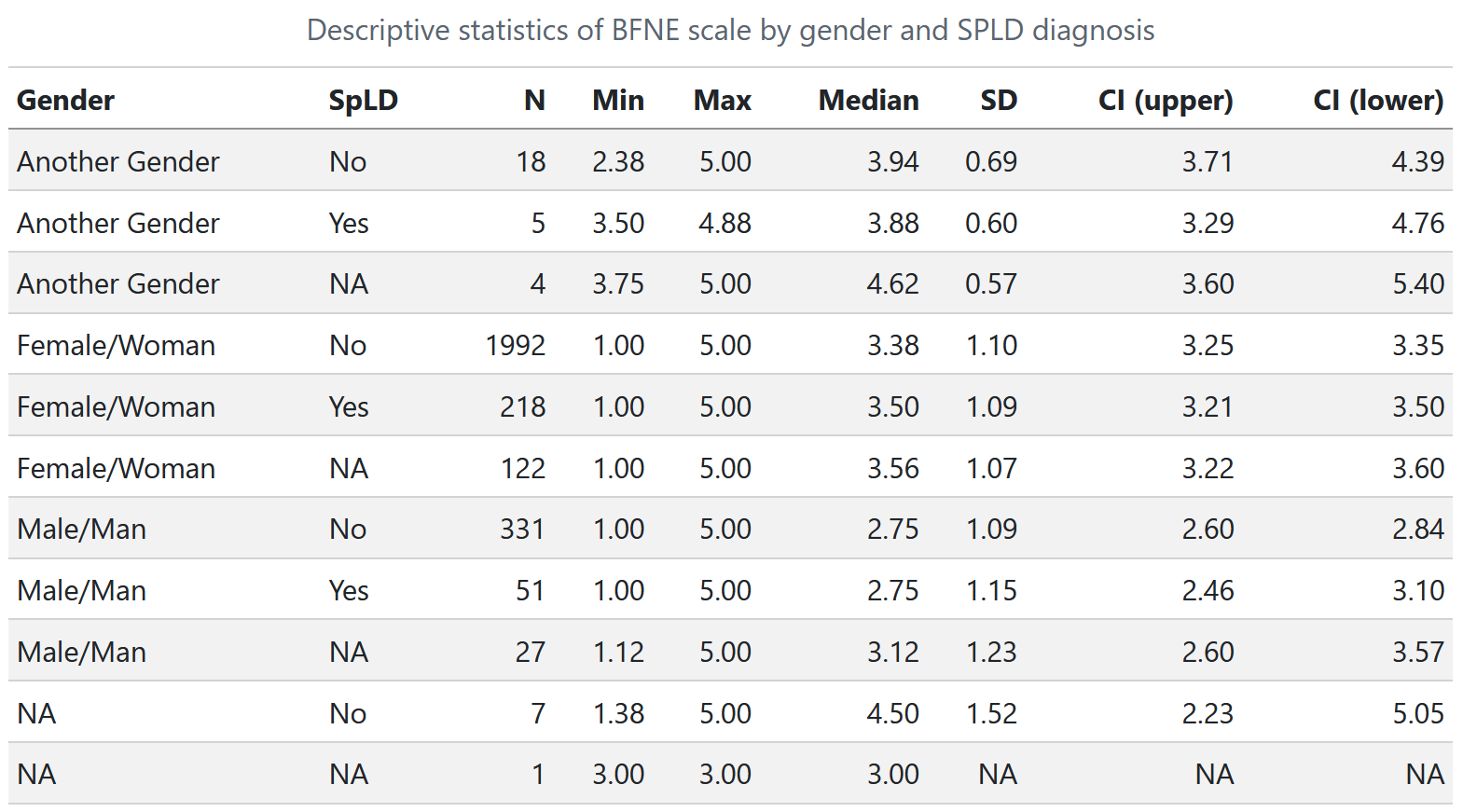 gender spld n min max mean median sd ci_lower ci_upper